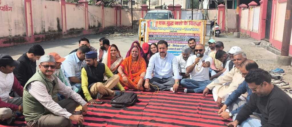 फोटो परिचय- नशे के खिलाफ जारी धरने मेँ मौजूद क्षेत्रवासी