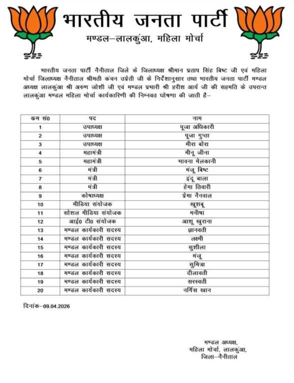 लालकुआं। भारतीय जनता पार्टी के जिला अध्यक्ष प्रताप बिष्ट एवं महिला मोर्चा की जिला अध्यक्ष कंचन उप्रेती के निर्देश पर लालकुआं मंडल अध्यक्ष अरुण जोशी एवं मंडल प्रभारी हरीश आर्य की सहमति के बाद लालकुआं
