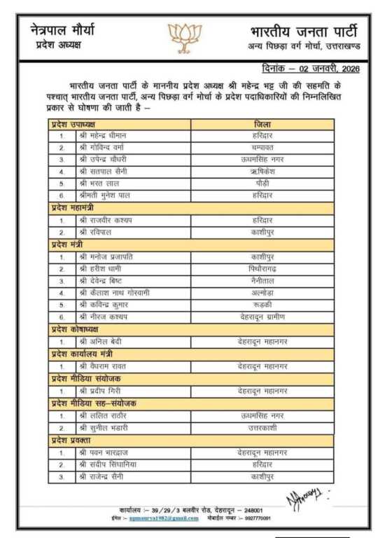 देहरादून। भारतीय जनता पार्टी के प्रदेश अध्यक्ष महेंद्र भट्ट ने आगामी 2027 के विधानसभा चुनाव को देखते हुए पार्टी में तेज तर्रार पदाधिकारियों की नियुक्ति का काम शुरू कर दिया है, प्रदेश अध्यक्ष महेंद्र भट्ट की सहमति के बाद संगठन के अन्य पिछड़ा वर्ग मोर्चा के प्रदेश अध्यक्ष नेत्रपाल मौर्य ने अपनी 22 सदस्यीय पदाधिकारियों की सूची जारी कर दी है, प्रदेश अध्यक्ष के मुताबिक पार्टी हाई कमान के निर्देश पर उनके द्वारा यह सूची जारी की गई है। जिसमे भारतीय जनता ओबीसी मोर्चा प्रदेश मंत्री के पद पर बिंदुखत्ता/ हल्दूचौड़ निवासी वरिष्ठ भाजपा नेता एवं दिशा के पूर्व डायरेक्टर देवेंद्र सिंह बिष्ट को नियुक्ति प्रदान की है। देवेंद्र बिष्ट को प्रदेश मंत्री बनाए जाने पर स्थानीय भाजपा कार्यकर्ताओं में खुशी की लहर है।