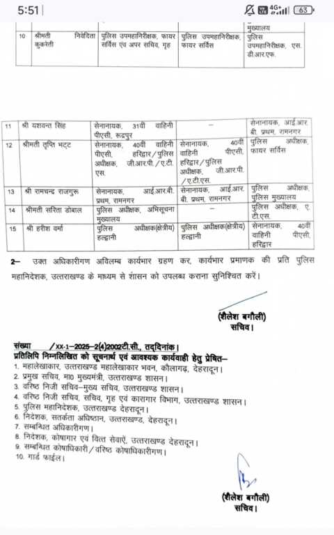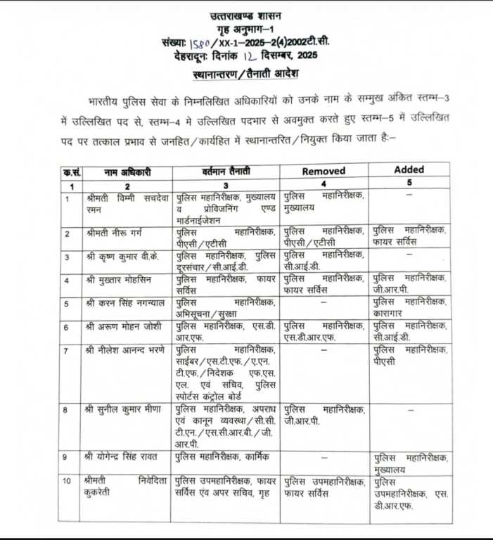 देहरादून। उत्तराखंड शासन ने पुलिस महकमे में एक बार फिर बड़ा प्रशासनिक बदलाव किया है। शासन ने लगभग दो दर्जन वरिष्ठ आईपीएस अधिकारियों के ट्रांसफर आदेश जारी किए हैं। जारी निर्देशों के अनुसार, अधिकारियों को उनके वर्तमान पदों से अवमुक्त करते हुए जनहित एवं कार्यहित में नए पदों पर तत्काल प्रभाव से नियुक्त किया गया है।