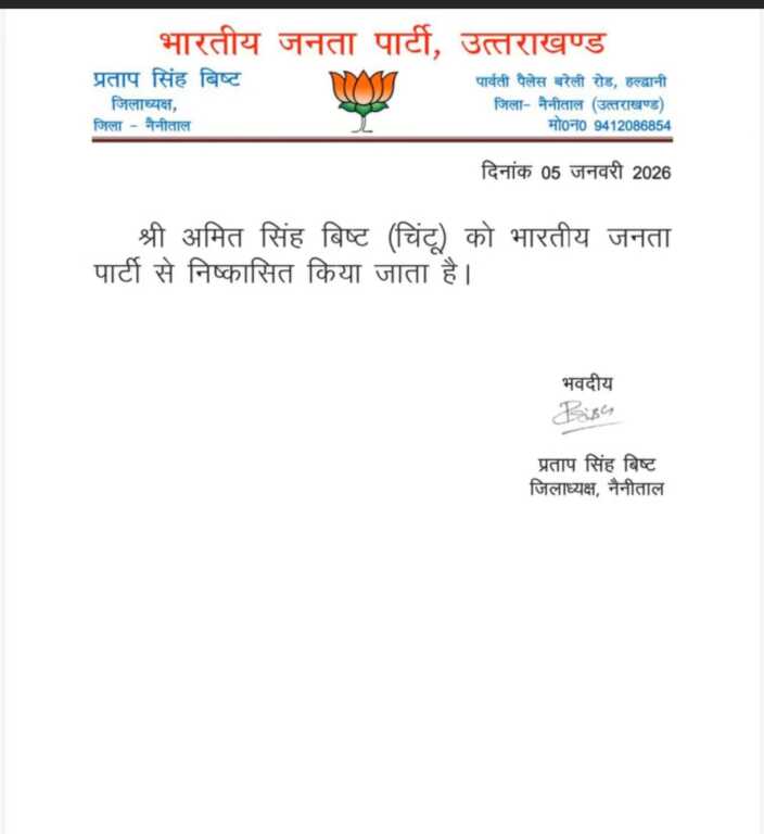हल्द्वानी। हल्द्वानी में हुए हत्याकांड में बीटेक के छात्र 24 वर्षीय नितिन लोहानी की गोली मारकर हत्या के मामले ने पूरे क्षेत्र को बुरी तरह हिला कर रख दिया। उक्त मामले में आरोप हल्द्वानी नगर निगम के पार्षद अमित बिष्ट उर्फ़ चिंटू पर लगे हैं, पुलिस द्वारा बाकायदा अमित बिष्ट को हिरासत में लिया गया है। इस संबंध में अपर पुलिस अधीक्षक हल्द्वानी द्वारा पत्रकारों को भी विस्तृत जानकारी से अवगत कराया गया है, पुलिस प्रकरण की गहनता के साथ जांच कर रही है। इधर भारतीय जनता पार्टी के जिलाध्यक्ष प्रताप बिष्ट द्वारा पार्षद एवं भारतीय जनता पार्टी के मंडल उपाध्यक्ष अमित बिष्ट को तत्काल प्रभाव से पार्टी से निष्कासित कर दिया है।