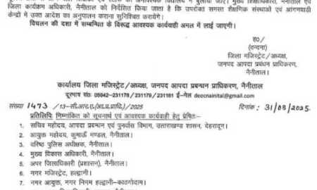 हल्द्वानी। भारत मौसम विज्ञान विभाग देहरादून द्वारा 31 अगस्त की दोपहर को जारी पूर्वानुमान के अनुसार, नैनीताल जिले में 1 सितंबर को भारी...