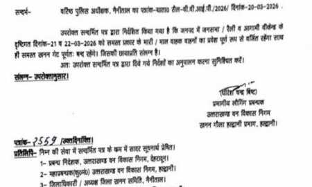 हल्द्वानी। प्रभागीय लौगिंग प्रबन्धक खनन गौला हल्द्वानी, उत्तराखण्ड वन विकारा निगम, खनन प्रभाग हल्द्वानी द्वारा जारी आदेश में समस्त अनुभाग अधिकारी खनन...
