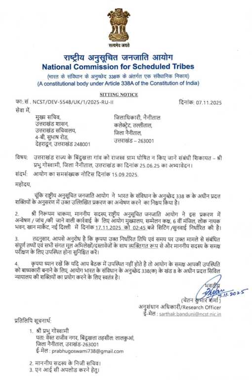 राष्ट्रीय अनुसूचित जनजाति आयोग के अनुसंधान अधिकारी चेतन कुमार शर्मा ने उत्तराखंड के मुख्य सचिव एवं जिलाधिकारी नैनीताल को नोटिस जारी करते हुवे