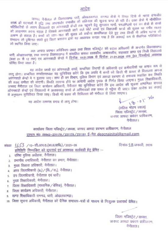 हल्द्वानी जिला मजिस्ट्रेट नैनीताल और अध्यक्ष आपदा प्रबंधन प्राधिकरण नैनीताल के अध्यक्ष ललित मोहन रयाल द्वारा जनपद के कई क्षेत्रों में भौगोलिक परिस्थितियां प्रतिकूल होने के चलते उक्त क्षेत्र में इंटरमीडिएट तक के स्कूल कॉलेजों तथा आंगनबाड़ी केंद्रों में तीन दिन के लिए अवकाश घोषित किया गया है।