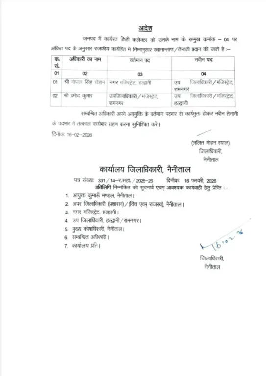 सिटी मजिस्ट्रेट गोपाल सिंह चौहान को SDM रामनगर बनाया । जबकि रामनगर के SDM प्रमोद कुमार को हल्द्वानी का SDM बनाया गया है। यह आदेश तत्काल प्रभाव से लागू कर दिए गए हैं।