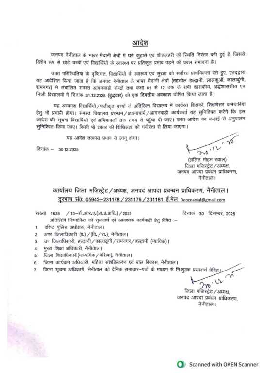 विद्यार्थियों के स्वास्थ्य एवं सुरक्षा को सर्वोच्च प्राथमिकता देते हुए जिला प्रशासन द्वारा बड़ा निर्णय लिया गया है। इसके तहत जनपद नैनीताल के भाबर मैदानी क्षेत्रों की तहसील हल्द्वानी, लालकुआँ, कालाढुंगी एवं रामनगर में संचालित समस्त आंगनबाड़ी केंद्रों तथा कक्षा 1 से 12 तक के सभी शासकीय, अर्द्धशासकीय एवं निजी विद्यालयों में दिनांक 31 दिसंबर 2025 (बुधवार) को एक दिवसीय अवकाश घोषित किया गया है।