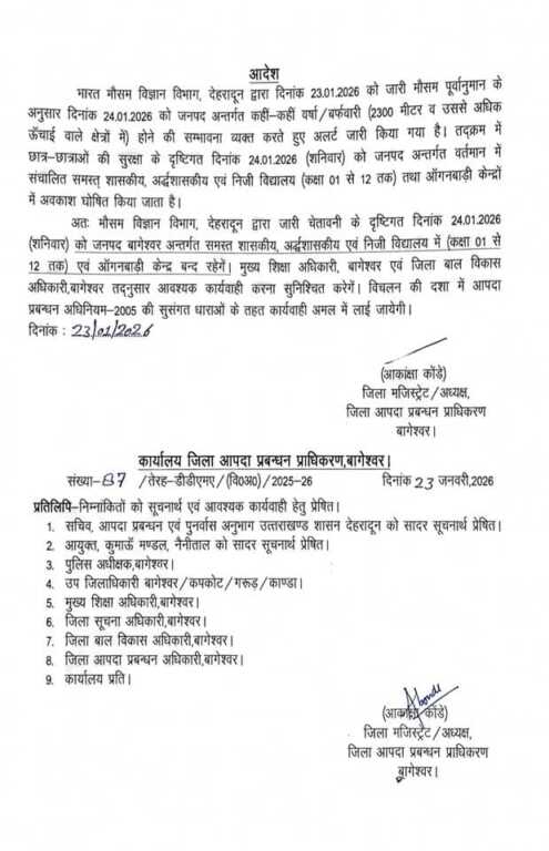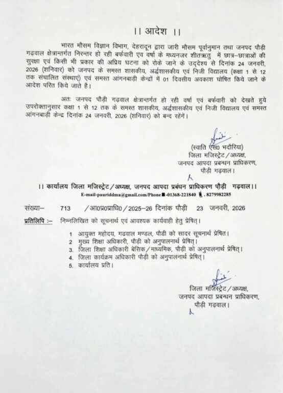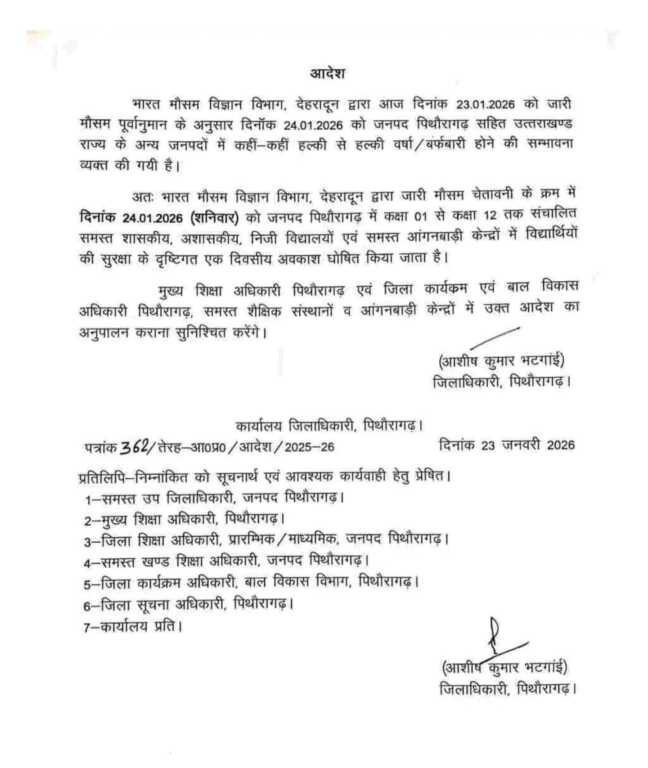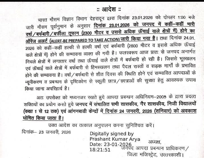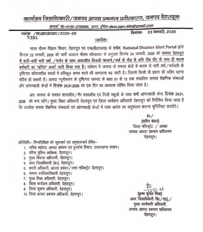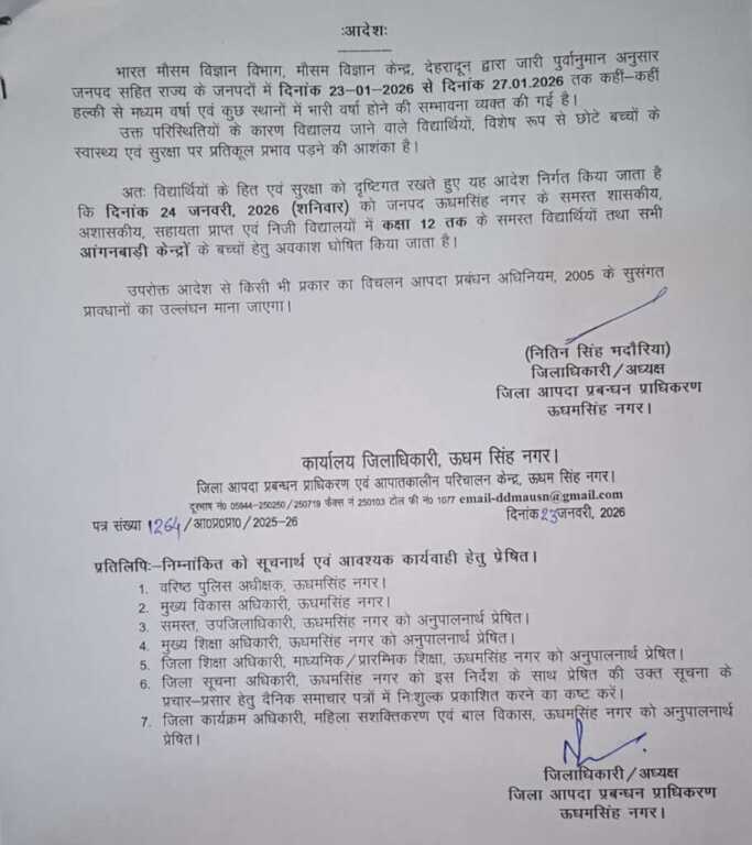 देहरादून। भारत मौसम विज्ञान विभाग, मौसम विज्ञान केन्द्र, देहरादून द्वारा जारी पुर्वानुमान अनुसार उत्तराखंड राज्य के आधा दर्जन से अधिक जनपदों में दिनांक 23-01-2026 से दिनांक 27.01.2026 तक कहीं-कहीं हल्की से मध्यम वर्षा एवं कुछ स्थानों में भारी वर्षा होने की सम्भावना व्यक्त की गई है।भारत मौसम विज्ञान विभाग, मौसम विज्ञान केन्द्र, देहरादून द्वारा जारी पुर्वानुमान अनुसार जनपद सहित राज्य के जनपदों में दिनांक 23-01-2026 से दिनांक 27.01.2026 तक कहीं-कहीं हल्की से मध्यम वर्षा एवं कुछ स्थानों में भारी वर्षा होने की सम्भावना व्यक्त की गई है।अतः विद्यार्थियों के हित एवं सुरक्षा को दृष्टिगत रखते हुए यह आदेश निर्गत किया जाता है कि दिनांक 24 जनवरी, 2026 (शनिवार) को जनपद ऊधमसिंह नगर देहरादून उत्तरकाशी, टिहरी, पिथौरागढ़ और पौड़ी समेत कई जनपदों क के समस्त शासकीय, अशासकीय, सहायता प्राप्त एवं निजी विद्यालयों में कक्षा 12 तक के समस्त विद्यार्थियों तथा सभी आंगनबाड़ी केन्द्रों के बच्चों हेतु अवकाश घोषित किया जाता है।उपरोक्त आदेश से किसी भी प्रकार का विचलन आपदा प्रबंधन अधिनियम, 2005 के सुसंगत प्रावधानों का उल्लंघन माना जाएगा।नितिन सिंह भदौरिया) जिलाधिकारी / अध्यक्ष जिला आपदा प्रबन्धन प्राधिकरण ऊधमसिंह नगर।