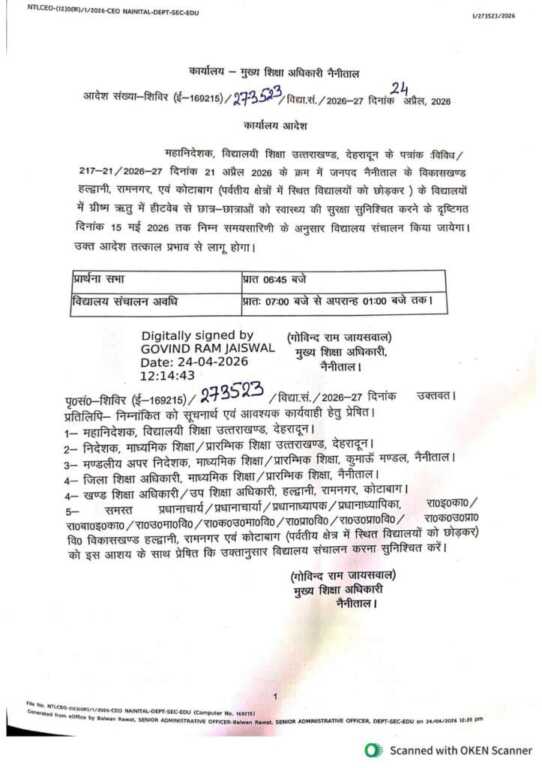 जारी आदेश के अनुसार, छात्र-छात्राओं के स्वास्थ्य की सुरक्षा को ध्यान में रखते हुए अब 15 मई 2026 तक विद्यालयों का संचालन सुबह के समय किया जाएगा। यह आदेश तत्काल प्रभाव से लागू कर दिया गया है।