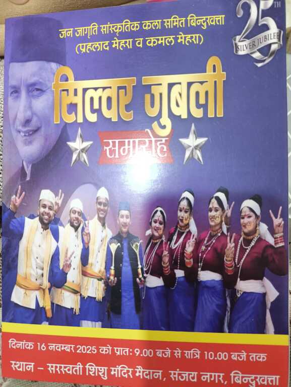 उक्त जानकारी देते हुए जन जागृति सांस्कृतिक कला समिति बिंदुखत्ता के अध्यक्ष कमल मेहरा ने बताया कि उत्तराखंड के प्रसिद्ध लोक गायक दिवंगत प्रहलाद मेहरा ने 1999 में जन जागृति सांस्कृतिक कला समिति की नींव रखी, आज जब उसकी सिल्वर जुबली का भब्य कार्यक्रम आयोजित किया जा रहा है, तो स्वर्गीय पहलाद मेहरा हम लोगों के बीच नहीं है, परंतु उनकी याद में उक्त सिल्वर जुबली कार्यक्रम का भव्य आयोजन 16 नवंबर को सरस्वती शिशु मंदिर मैदान संजय नगर बिंदुखत्ता में किया जा रहा है, जिसमें बतौर मुख्य अतिथि महाराष्ट्र के पूर्व राज्यपाल भगत सिंह कोश्यारी होंगे। उन्होंने बताया कि प्रातः 9 बजे से रात्रि 10 बजे तक आयोजित होने वाले इस कार्यक्रम के दौरान मैराथन दौड़, कलश यात्रा, बच्चों का डांस ग्रुप प्रतियोगिता, छोलिया नृत्य, स्वर्गीय प्रहलाद मेहरा की जीवनी पर प्रस्तुति, उत्तराखंड के वरिष्ठ कलाकारों का सम्मान, सांस्कृतिक कार्यक्रम, स्वयं सहायता समूह द्वारा तैयार हिमालय जड़ी बूटी, कुमाऊनी खानपान व वेशभूषा, हथकरघा एवं हस्तशिल्प से निर्मित वस्तुओं एवं ऊनी वस्त्रो तथा कुमाऊनी कलाकृतियों की भव्य प्रदर्शनी का आयोजन किया जाएगा।
