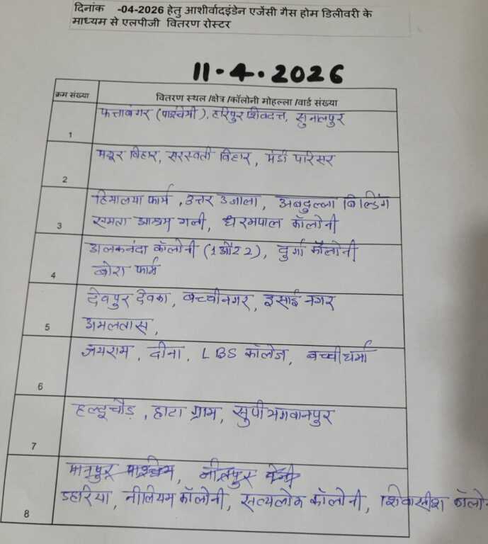 लालकुआं। लालकुआं, बरेली रोड और बिंदुखत्ता क्षेत्र के अन्तर्गत क्षेत्रों में गैस सिलेंडरों का 11 अप्रैल दिन शनिवार को वितरण इस प्रकार किया जा रहा है,