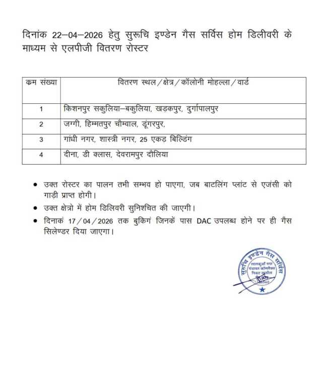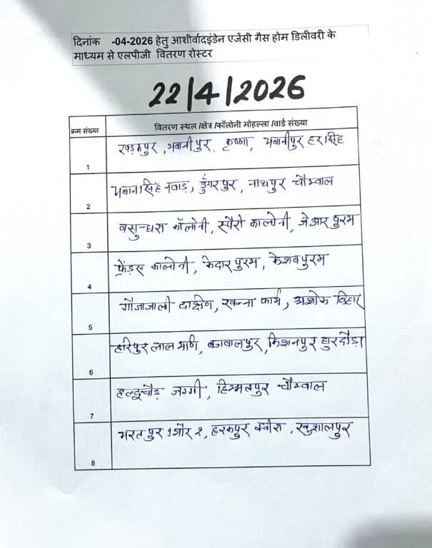 लालकुआं। लालकुआं, बिंदुखत्ता और बरेली रोड में कल इन इलाकों में रसोई गैस के सिलेंडर वितरण किए जाएगें, प्रशासन ने उक्त क्षेत्र की लिस्ट जारी की है। बिंदुखत्ता, हल्दूचौड़ क्षेत्रों में गैस सिलेंडरों का वितरण 17 अप्रैल तक बुकिंग वालों को किया जाएगा।