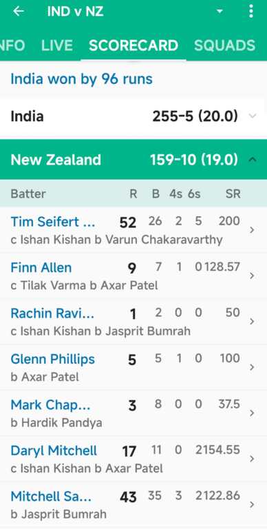 256 रनों के लक्ष्य का पीछा करने उतरी न्यूजीलैंड की शुरुआत अच्छी नहीं रही। टीम ने तीसरे ओवर में पहला विकेट गंवाया। फिल एलन 7 गेंद में नौ रन ही बना सके। रचिन रविंद्र दो गेंद में ही एक रन ही बना पाए। ग्लेन फिलिप्स ने 5 गेंद में 5 रन बनाए। मार्क चैपमैन 8 गेंद में तीन रन ही बना सके। टिम साइफर्ट ने 26 गेंद में ताबड़तोड़ 52 रन बनाए।