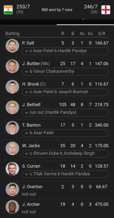 भारत की ओर से मिले 254 रन के लक्ष्य का पीछा करते हुए इंग्लैंड की टीम 20 ओवर में 246 रन ही बना पाई।