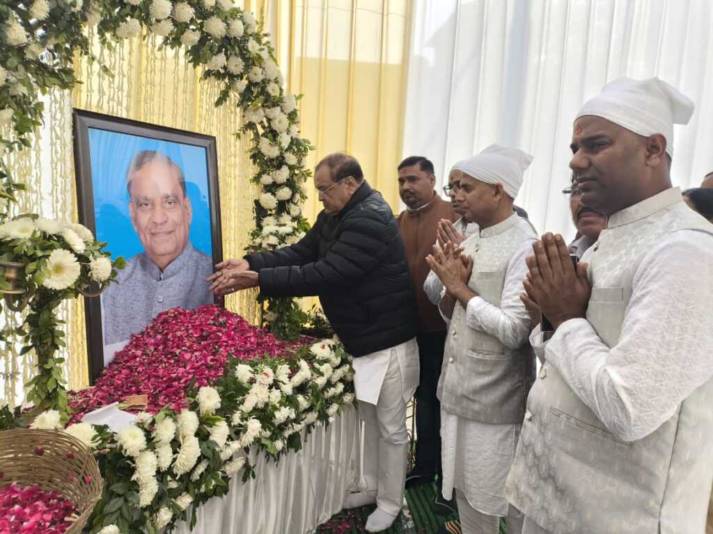 फोटो परिचय- स्वर्गीय रामबाबू मिश्रा के चित्र के समक्ष श्रद्धांजलि अर्पित करते गणमान्य लोग