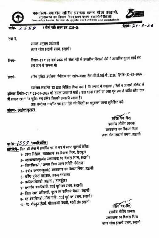 हल्द्वानी। प्रभागीय लौगिंग प्रबन्धक खनन गौला हल्द्वानी, उत्तराखण्ड वन विकारा निगम, खनन प्रभाग हल्द्वानी द्वारा जारी आदेश में समस्त अनुभाग अधिकारी खनन गौला हल्द्वानी प्रभाग, हल्द्वानी। को निर्देशित किया गया है कि दिनांक-21 व 22 मार्च 2026 को गौला नदीं के उपखनिज निकासी गेटों में उपखनिज चुगान कार्य बन्द रखे जाएंगे।