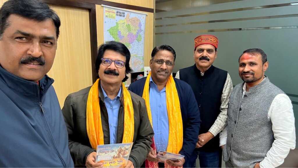 फोटो परिचय- श्री राम कथा का निमंत्रण सेंचुरी मिल के सीईओ अजय गुप्ता को देते समिति के पदाधिकारी