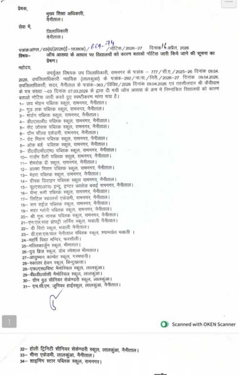 उपर्युक्त विषयक उप जिलाधिकारी, रामनगर के पत्रांक 777/सी.ए./2025-26 दिनांक 09.04. 2026, उपजिलाधिकारी न्यायिक (लालकुंआ) के पत्रांक-292/ना.ना./निरी./2026-27 दिनांक 09.04.2026, उपजिलाधिकारी, सदर, नैनीताल के पत्रांक-363/विविध/2026 दिनांक 09.04.2026 एवं तहसीलदार श्री कैंचीधाम के पत्र संख्या – 03 दिनांक 07.03.2026 के द्वारा दी गयी जॉच आख्या के क्रम में निम्नांकित विद्यालयों को कारण