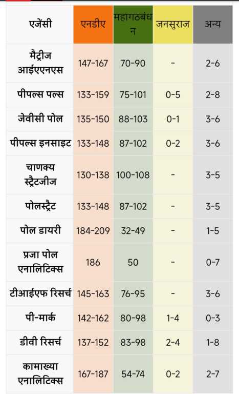 MATRIZE-आईएएनएस का एग्जिट पोल सबसे पहले सामने आया जिसमें NDA को 147-167 तथा महागठबंधन को 70-90 सीटें मिलने का अनुमान है. इसके अलावा 8 और एग्जिट पोल आए हैं और सभी में एनडीए को बंपर बहुमत मिलता दिख रहा है. हालांकि, असली तस्वीर 14 नवंबर को मतगणना के दिन ही साफ होगी, जब वोटों की गिनती के बाद नतीजे आधिकारिक रूप से सामने आएंगे।