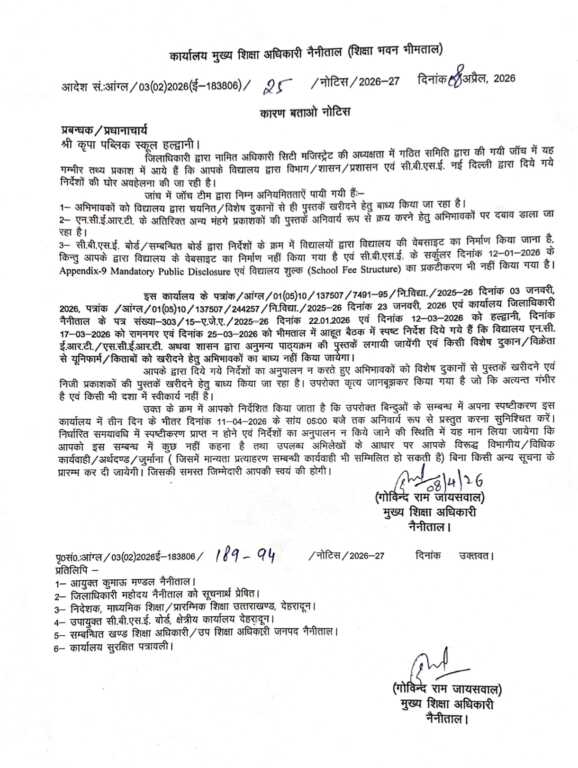 इस संबंध में मुख्य शिक्षा अधिकारी ने जनपद के सभी प्रधानाचार्य, प्रधानाध्यापक, राजकीय इंटर कॉलेज राजकीय बालिका इंटर कॉलेज, राजकीय उच्च माध्यमिक विद्यालय, राजकीय कन्या उच्च माध्यमिक विद्यालय एवं समस्त खंड शिक्षा अधिकारियों, उप शिक्षा अधिकारियों को निर्देश दिए हैं कि वह उक्त के क्रम में अपने विद्यालय के भौगोलिक क्षेत्र के अंतर्गत संचालित समस्त निजी विद्यालयों के संबंध में स्पष्ट प्रमाणिक सूचनाओं, जिसमें विद्यालय मान्यता प्राप्त है या नहीं यदि, मान्यता प्राप्त है तो यू डाइस कोड क्या है, तथा किस बोर्ड से विद्यालय मान्यता प्राप्त है उसकी जानकारी, मान्यता प्राप्त किए जाने की व वैधता की तिथि के साथ ही मान्यता प्रदान करने वाले सक्षम अधिकारी का नाम पदनाम की प्रामाणिक सूचना संकलित कर मान्यता प्रमाण पत्र की प्रति संलग्न करते हुए संबंधित क्षेत्र के खंड शिक्षा अधिकारी कार्यालय को दिनांक 10 अप्रैल 2026 तक उपलब्ध कराना सुनिश्चित करें। इस संबंध में उन्होंने समस्त खंड शिक्षा अधिकारियों, उप शिक्षा अधिकारियों को भी आवश्यक निर्देश जारी करते हुए संबंधित सूचना 11 अप्रैल 2026 तक उपलब्ध कराने को कहा है।