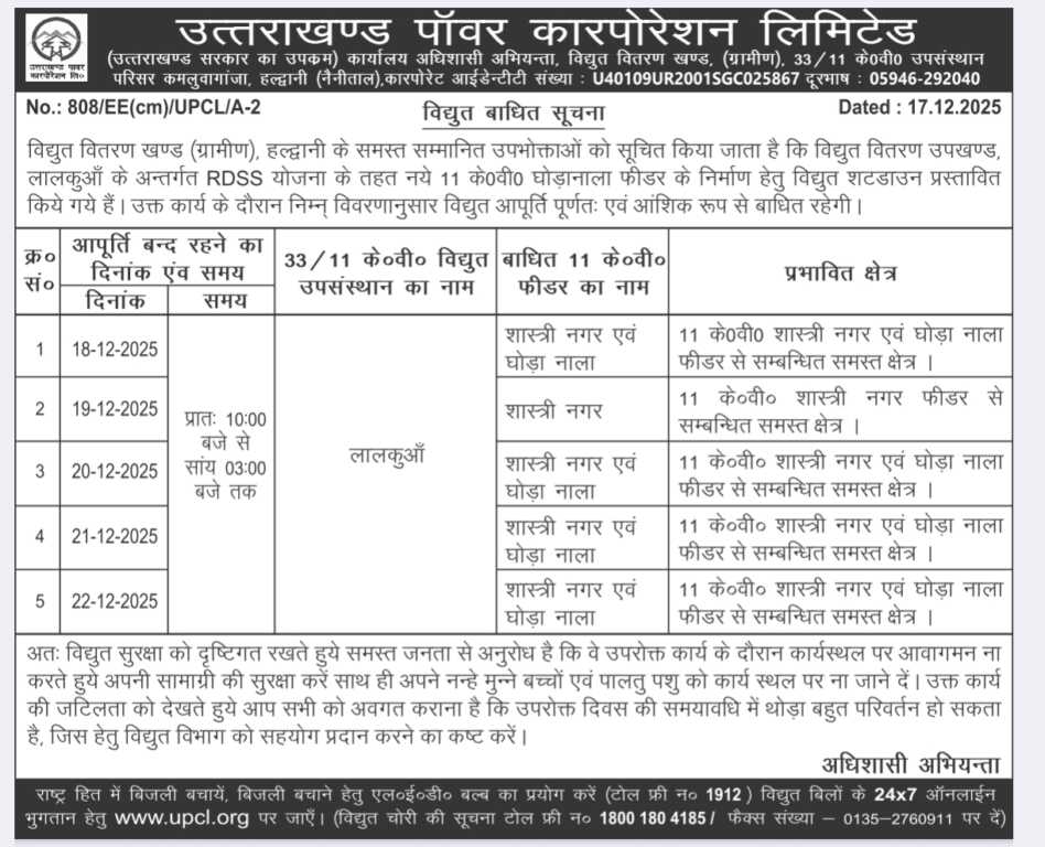 हल्द्वानी। विद्युत विभाग द्वारा लालकुआं, बिंदुखत्ता क्षेत्र में 22 दिसंबर तक विद्युत कटौती की सूचना सार्वजनिक की गई है। विद्युत विभाग के विद्युत वितरण खंड हल्द्वानी ग्रामीण द्वारा जारी की गई विज्ञप्ति में क्रमशः 18 दिसंबर से 22 दिसंबर तक विद्युत कटौती का रोस्टर जारी किया गया है, विस्तृत जानकारी लिए उक्त आदेश को पढ़ें