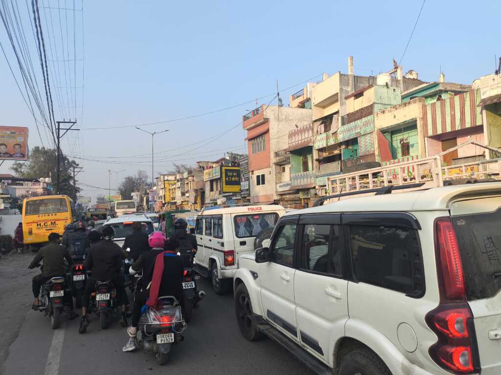 फोटो परिचय- लालकुआं में वाहनों की लगी भारी कतार का दृश्य