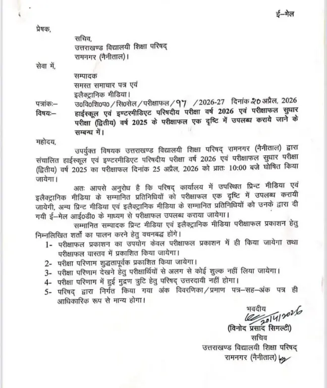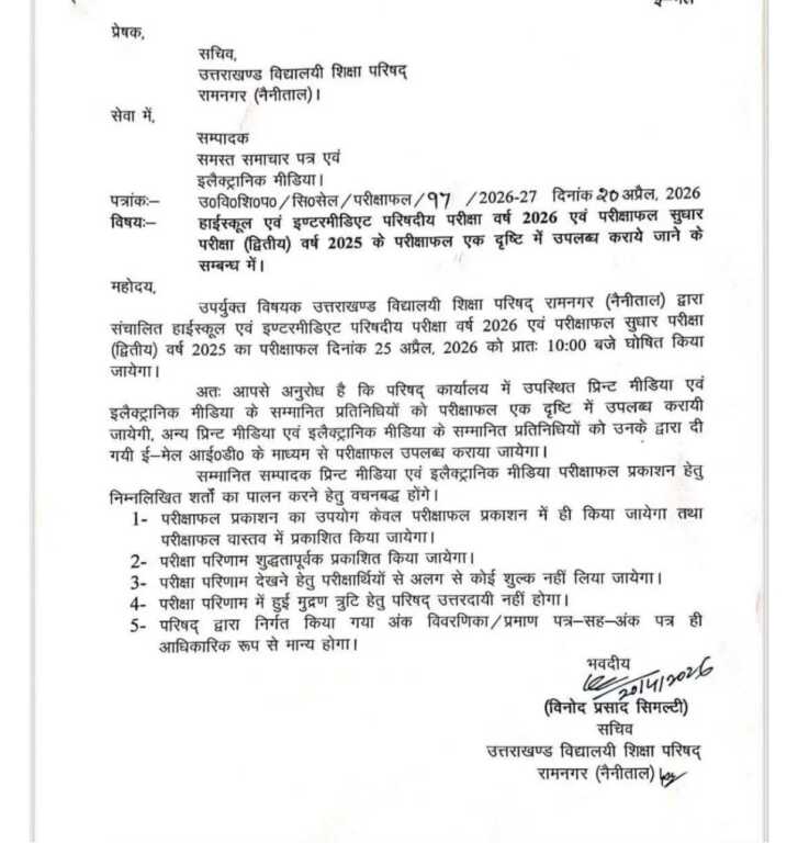 देहरादून। उत्तराखंड विद्यालयी शिक्षा परिषद के सचिव विनोद कुमार सिमल्टी द्वारा जारी आदेश में हाईस्कूल एवं इण्टरमीडिएट परिषदीय परीक्षा वर्ष 2026 एवं परीक्षाफल सुधार परीक्षा (द्वितीय) वर्ष 2025 के परीक्षाफल एक दृष्टि में उपलब्ध कराने की पूरी कार्रवाई हो गई है।