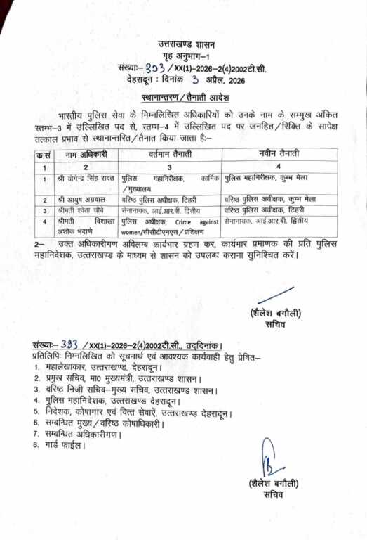 देहरादून। उत्तराखंड शासन ने पुलिस महानिरीक्षक समेत कई वरिष्ठ पुलिस अधीक्षकों की नवीन तैनाती के आदेश जारी किए हैं। सचिव गृह शैलेश बगौली द्वारा जारी आदेश में कुंभ मेला क्षेत्र में पुलिस अधिकारियों की तैनाती की है।