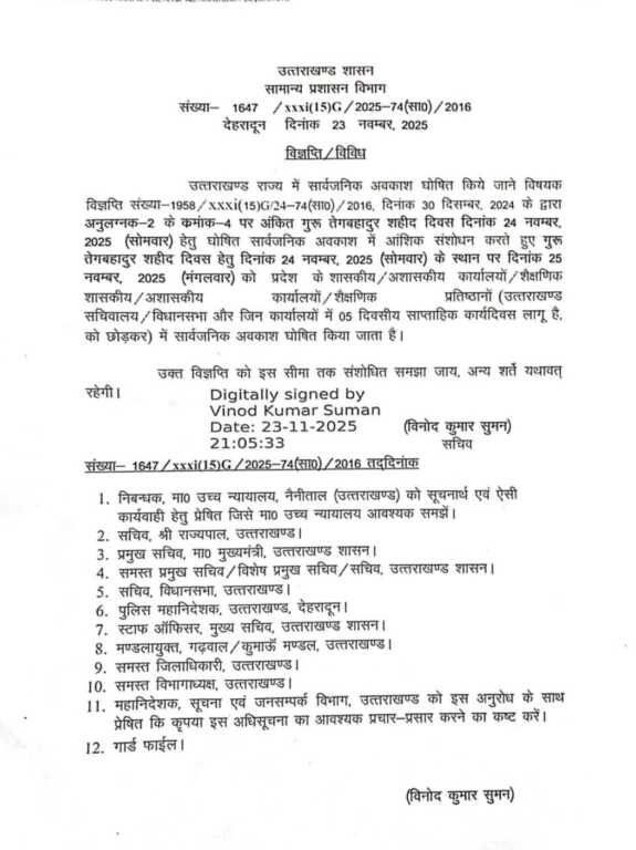 देहरादून। उत्तराखंड शासन ने गुरू तेग बहादुर शहीदी दिवस दिनांक 24 नवम्बर, 2025 (सोमवार) हेतु घोषित सार्वजनिक अवकाश में आंशिक संशोधन करते हुए दिनांक 25 नवम्बर, 2025 (मंगलवार) को सार्वजनिक अवकाश घोषित किया गया है। यह आदेश सामान्य प्रशासन विभाग के सचिव विनोद कुमार सुमन द्वारा जारी किया गया है।