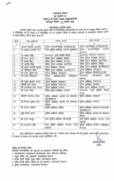 देहरादून। गोलियों की तड़तड़ाहट से सहमें देहरादून के वरिष्ठ पुलिस अधीक्षक और किसान सुखवंत सिंह की आत्महत्या कांड के बाद सुर्खियों में आए उधम सिंह नगर के एसएसपी समेत 20 पुलिस अधिकारियों के तबादले करते हुए उत्तराखंड शासन ने पुलिस महकमे में अहम बदलाव किए हैं। आदेश के तहत देहरादून और हरिद्वार जिलों के वरिष्ठ पुलिस अधीक्षकों (SSP) को बदल दिया गया है, जिससे दोनों संवेदनशील जिलों में कानून व्यवस्था की रणनीति नए सिरे से तय होने की संभावना है। शासन ने सभी अधिकारियों को तत्काल प्रभाव से कार्यभार ग्रहण करने के निर्देश दिए हैं।