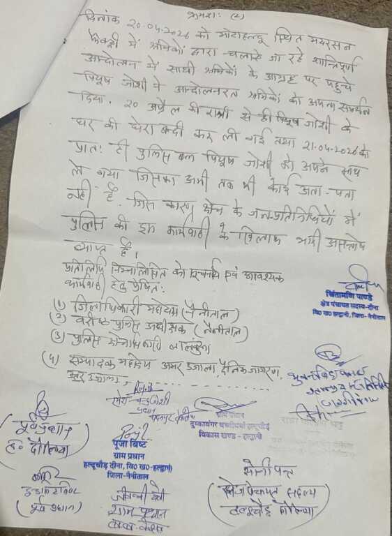 बरेली रोड क्षेत्र के ग्राम प्रधान एवं क्षेत्र पंचायत सदस्यों ने स्वयं कोतवाली लालकुआं पहुँचकर प्रभारी निरीक्षक ब्रजमोहन सिंह राणा को ज्ञापन सौंपते हुए कहा कि क्षेत्र में नशे के खिलाफ लंबे समय से बिगुल बजा रहे समाजसेवी पीयूष जोशी को राजनीतिक द्वेष भावना के चलते मदरसन फैक्ट्री के श्रमिकों के समर्थन में जाने पर उनके घर से गिरफ्तार करके पुलिस द्वारा अनैतिक कार्य किया गया है। उन्होंने तत्काल पीयूष जोशी को बिना शर्त रिहा करने की जोरदार मांग करते हुए पुलिस द्वारा की गई इस कार्यवाही की कड़े शब्दों में निंदा की। ज्ञापन सौंपने वालों में क्षेत्र पंचायत सदस्य चिंतामणि पांडे, ग्राम प्रधान पूजा बिष्ट, रमेश जोशी, जानकी देवी, सोनी पन्त, राधा कैलाश भट्ट, रुक्मणी नेगी, गरिमा पांडे और इंद्र बिष्ट सहित भारी संख्या में जनप्रतिनिधि मौजूद रहे।